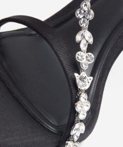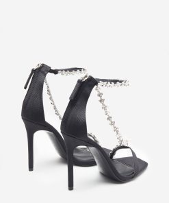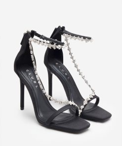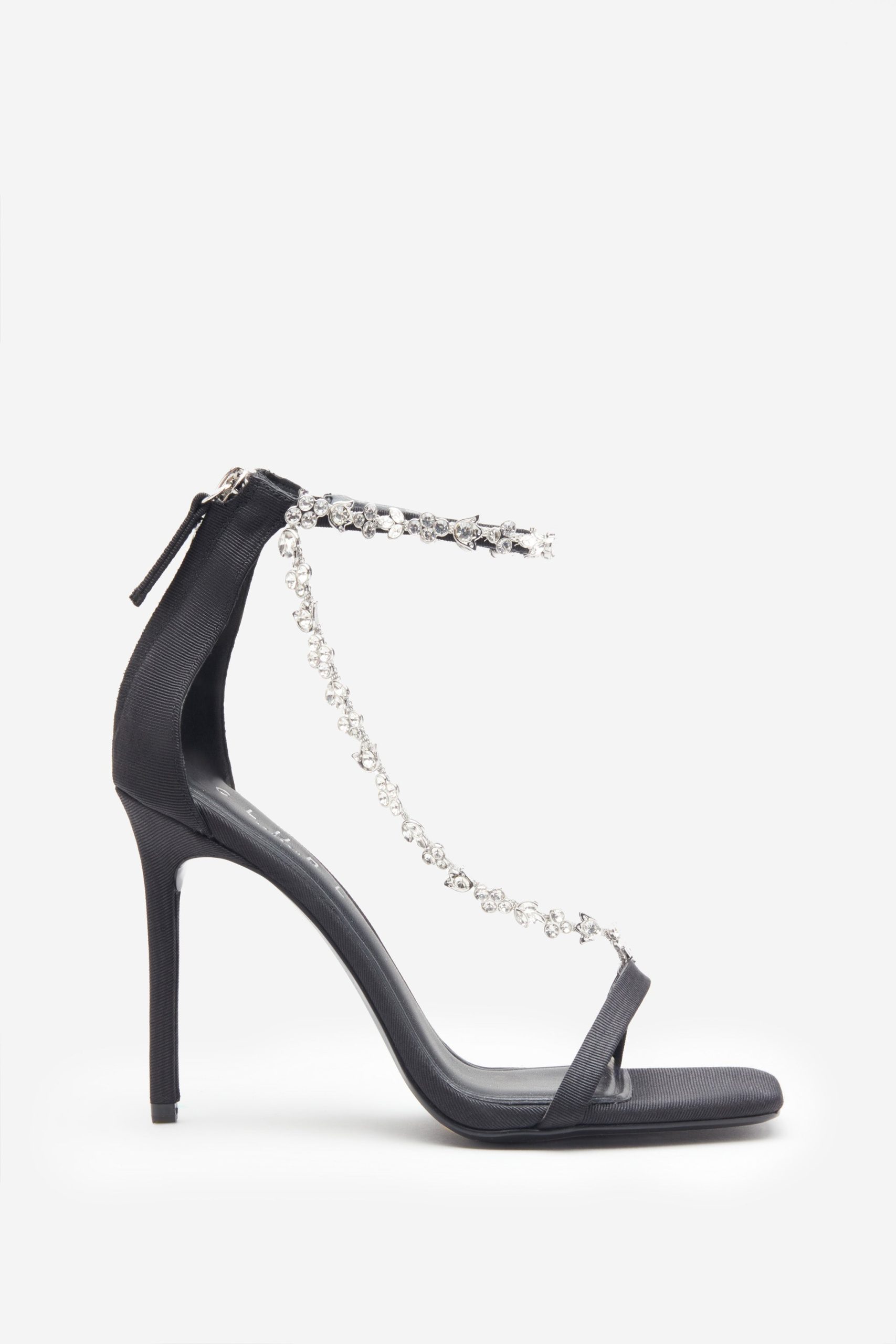 Seraphine London™ delivers sleek elegance with this stiletto sandal designed to command attention. Crafted from luxurious black satin, the silhouette features a square open toe, a delicate diamanté chain that drapes across the foot, and a discreet zip fastening. Refined yet impactful, this heel adds height and allure to every after-dark look.