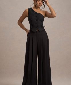 Seraphine London™ delivers a refined staple designed for effortless sophistication. Tailored from premium black stretch crepe, these high-waisted trousers feature soft pleating and a wide-leg silhouette that moves with grace. A hook-and-bar fastening with an invisible zip closure completes the look, perfect for both tailored daywear and after-dark styling.
