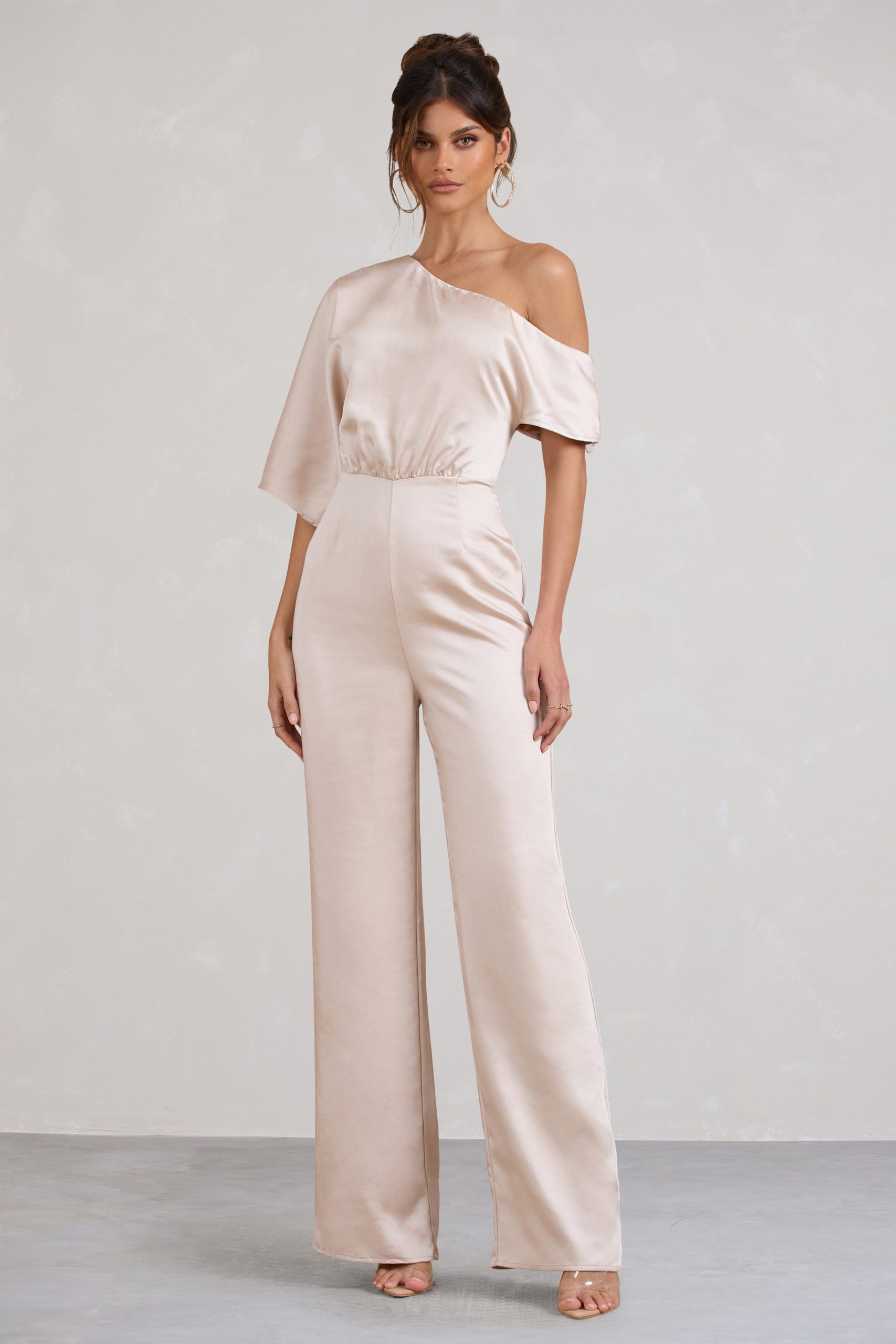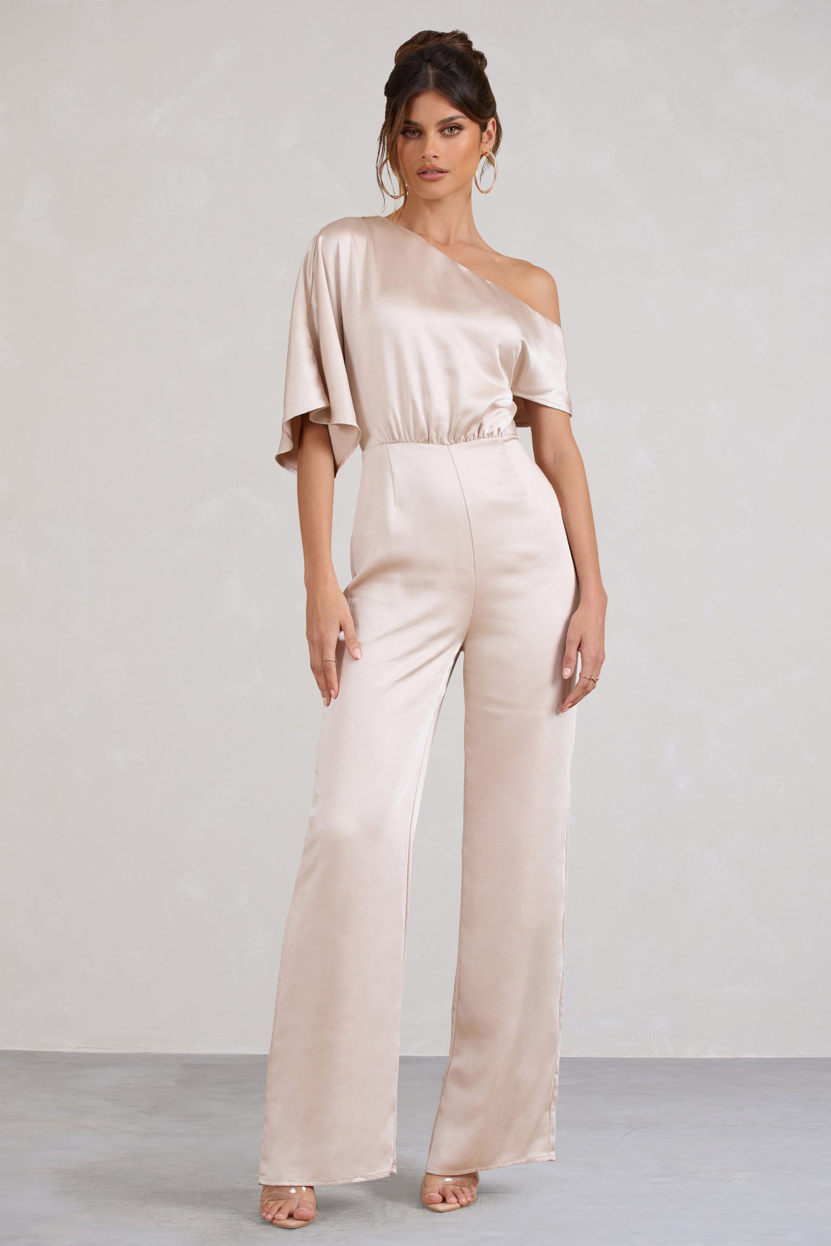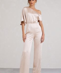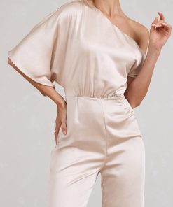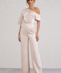 Seraphine London™ introduces a refined statement piece designed to stand out from day to night. Crafted in premium heavy satin, this champagne-hued jumpsuit features a fluid asymmetric neckline with softly draped short sleeves. Subtle shaping darts define the waist, while flared legs add movement and grace. Whether styled for a sophisticated brunch or a black-tie affair, this tailored silhouette delivers effortless elegance.