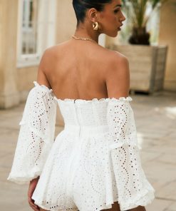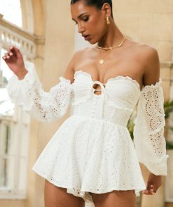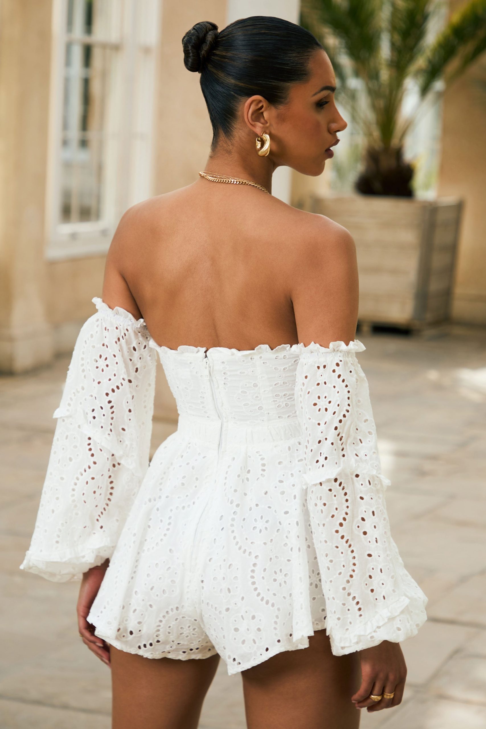Seraphine London™ captures carefree elegance with this breezy white playsuit, perfect for sun-drenched escapes and coastal afternoons. Crafted from premium broderie cotton, this design features a ruffled Bardot neckline and voluminous sleeves that add playful charm. With its softly structured silhouette and feminine flair, this piece is made for effortless holiday styling.