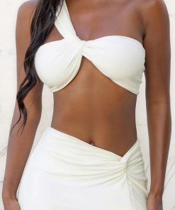 Seraphine London™ delivers a fresh take on minimalism with this refined white bralette. Designed in premium stretch jersey, the silhouette features a single shoulder strap and a sculptural twist at the bustline. With its clean lines and secure rear zip fastening, this piece brings understated elegance to resort evenings or elevated city styling.